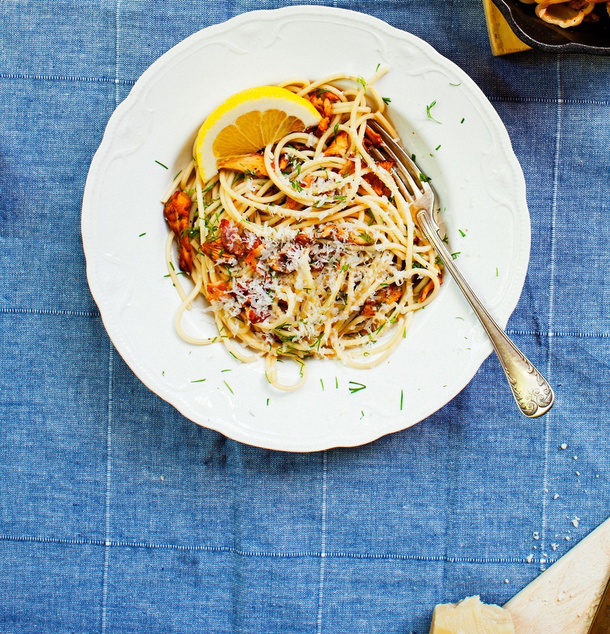 Herkullinen pasta syntyy, kun kypsän pastan lisäksi kantarellien ja pekonin joukkoon lisää vain lorauksen keitinvettä sekä sitruunanmehua ja hiukan parmesaania. Tuoreista yrteistä tilli toimii tässä yhteydessä yllättävän hyvin.