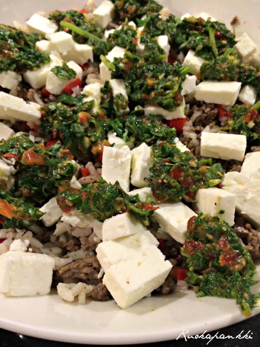 Keitä risottoriisiä paketin ohjeen mukaan suolavedessä.Kuullota sipulisilppu pannulla öljyn kera. Lisää jauhelihaa ja paista se kypsäksi. Lisää pilkotut paprikanpalat joukkoon ja mausta mustapippurilla sekä suolalla. Anna maustua hetken.Tee basillikaöljylisuke seuraavasti eli murskaa valkosipulit juomalasiin, silppua basillika ja liitä valkkareiden joukkoon, rouhi pippuria ja lisää oliiviöljyä niin että peittää basillikat. Sekoita hyvin. TAI laita kaikki tehosekoittimeen ja vola homma oli siinä.Sekoita riisi ja jauhelihamösserö keskenään ja pilko/revi fetaa päälle. Lusikoi basillikasösseröt päälle ja laita uuniin 225 asteeseen noin 20-30 minuuttia, niin että feta saa kauniin ruskean pinnan.VOLA JA RISOTTO ON VALMIS, tarjoa se raikkaan salaatin kera.