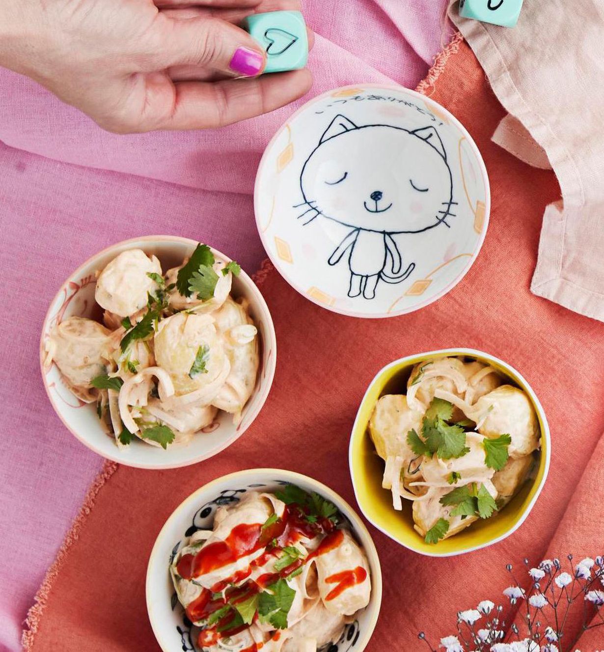 Perunasalaatin voi tehdä myös aasialaisittain, jos pitää chilin potkusta. Sriracha-kastikkeen määrää muuntamalla saat sopivan tulista.