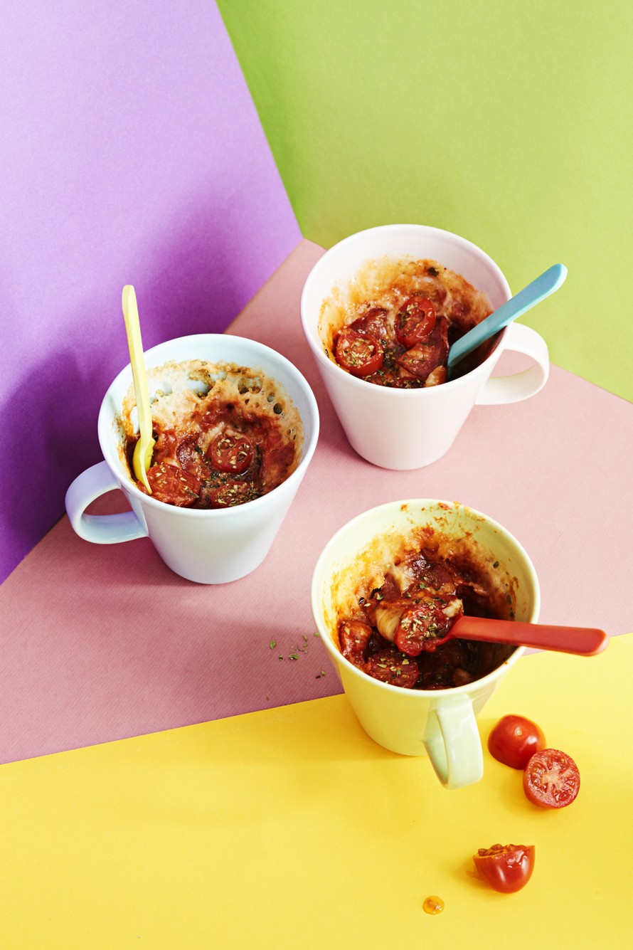 Suolainen mukikakku? Ei, vaan jotain vielä parempaa. Gluteeniton "mukipizza" rakentuu sekoitettavasta pohjasta, täytteestä ja juustosta mikrossa yhdellä napin painalluksella. Pling, ja telkkarieväs on valmis!