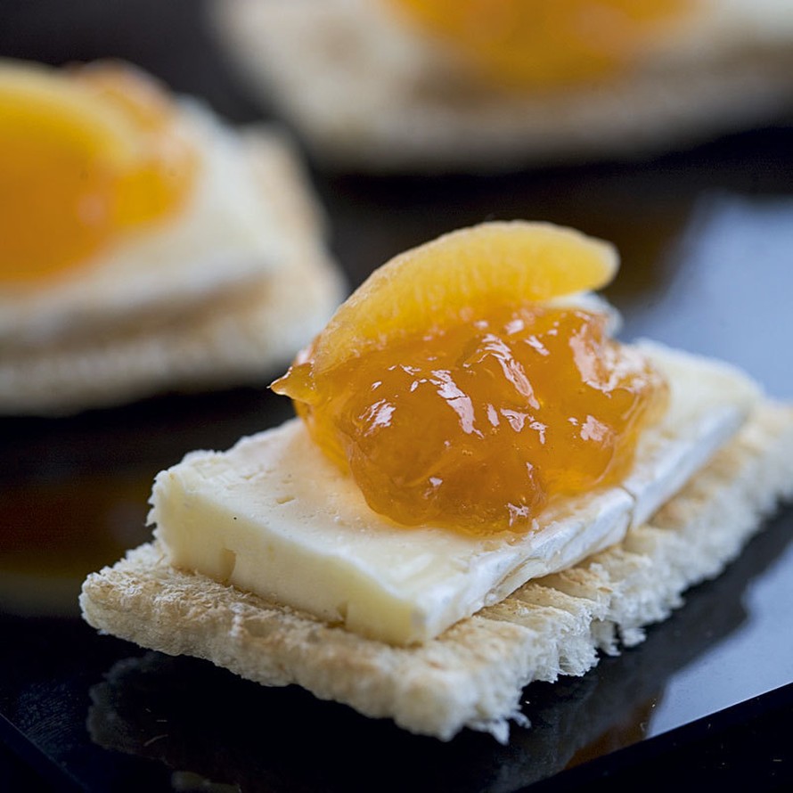 - Paloittele keksit kolmeen osaan. Leikkaa juusto keksien päälle. Lusikoi päällimmäiseksi nokare hilloa.