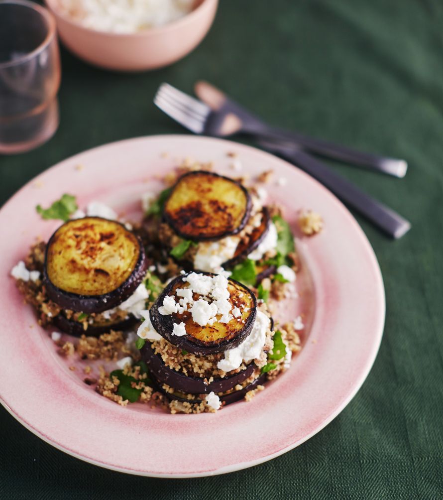 Paistetut munakoisokiekot kootaan torneiksi! Niiden väliin sujautetaan kuskusia ja maustettua jauhelihaa. Koko komeus viimeistellään jugurtilla ja fetalla.