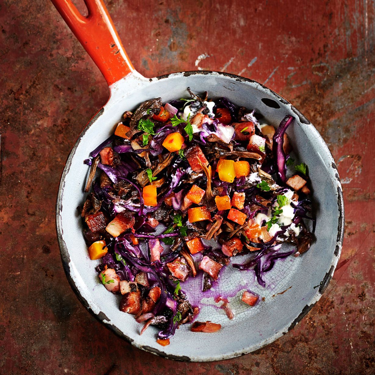 - Kuutioi possunkylki ja sipuli. Lisää kuutiot pannuun ruskistumaan viideksi minuutiksi. Lisää sienet ja kaalit. Anna paistua pari minuuttia. Lisää lopuksi kurpitsasalaatti.