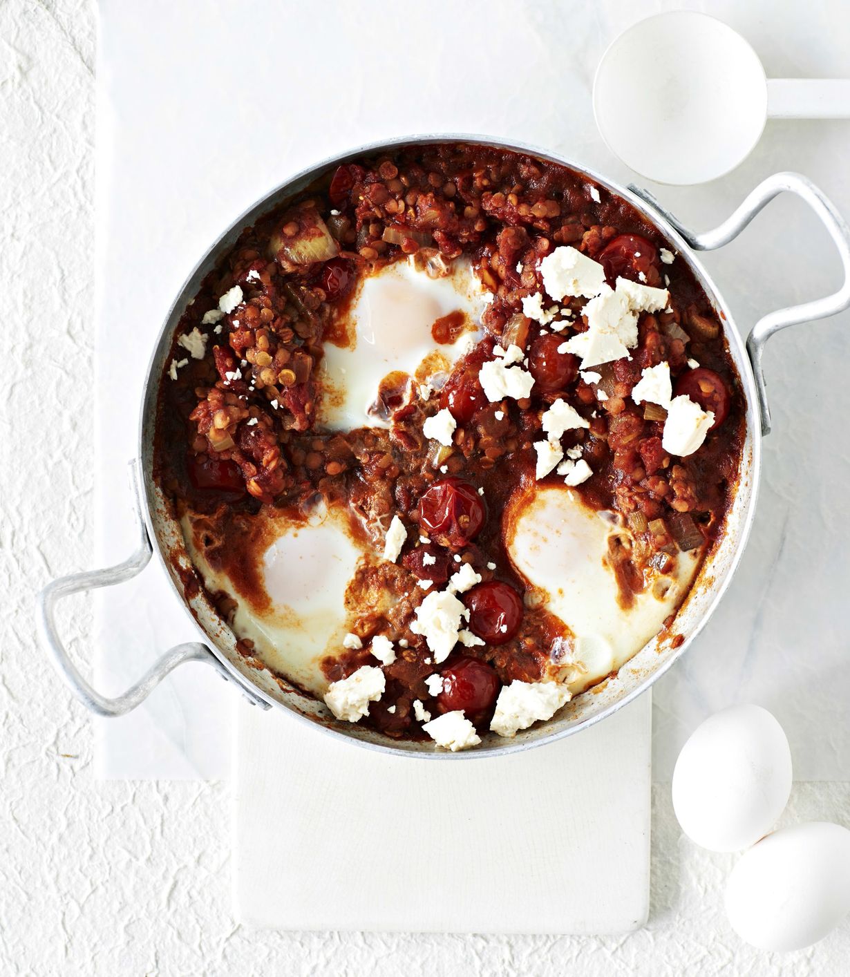 Shakshuka on klassikko, jonka ruokaisempi versio tehdään linsseistä. Maustehyllyllä selviää edullisemmin, kun valitsee monen maustepussin sijasta yhden seoksen.