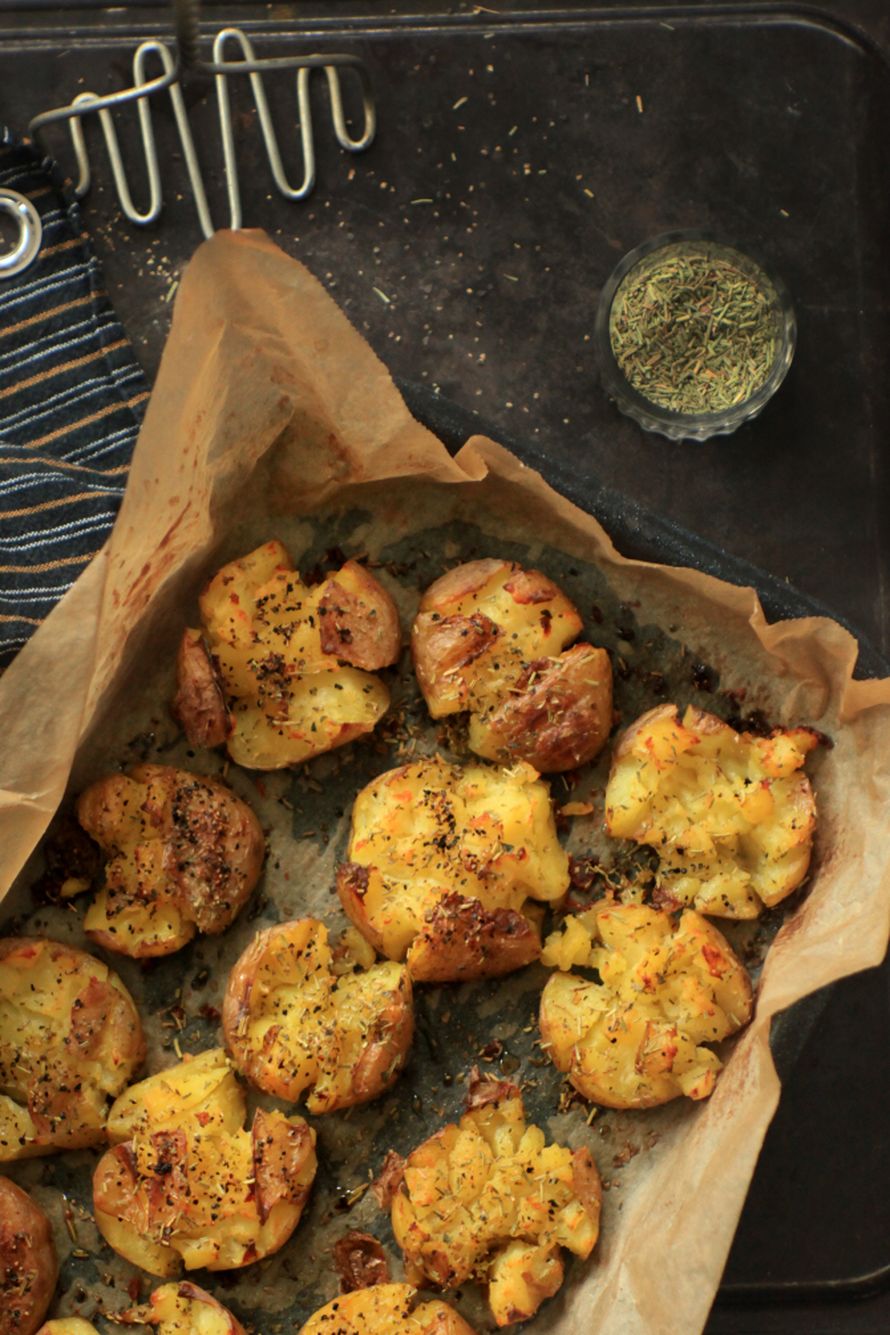 Kumoa keitetyt perunat uunipellille ja murskaa niitä esim. juomalasin pohjalla tai kauhalla.