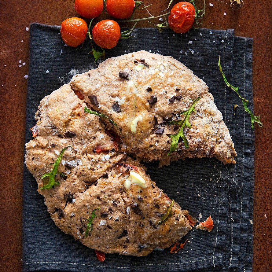 Suklaa-tomaattileipä syödään lämpimänä voinokareen ja rucolan kanssa.