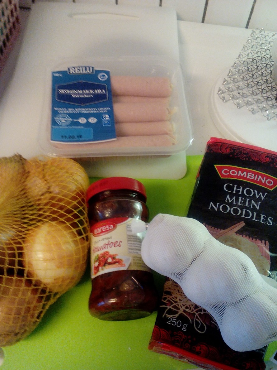 Laita Nuudelit kippoon ja kaada päälle kuuma vesi, maustetta. Sekoita sopivassa välissä.