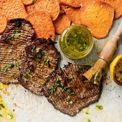 Naudan lehtipihvit, bataattilastut ja oregano-persiljakastike