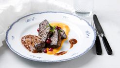 Konjakilla liekitetty naudan maksa ja bataattipyree