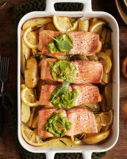 Uunikalaa rucolapestolla ja sitruuna-rosmariiniperunoita