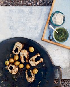 Grillatut ahvenet, raparperichutney ja kukkakaali-perunacurry