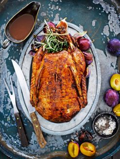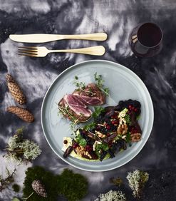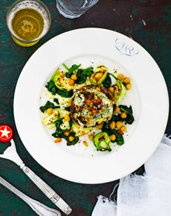 Lehtikaalipestolla täytetyt portobellot, polentamuusi ja kikherne-pinaattisalaatti Glorian ruoka ja viini lisäsi reseptin