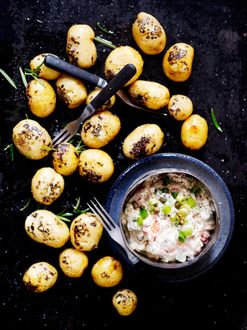 Savustettuja varhaisperunoita ja kylmäsavulohi-wasabikastiketta