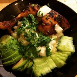Linssi-broilerisalaatti ja cashewjogurtti