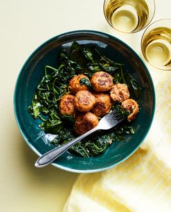 Manteliset broileripyörykät ja pikapaistettu pinaatti