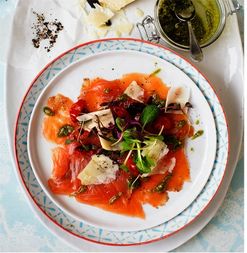 Graavilohta tillipeston ja paahdettujen kirsikkatomaattien kera