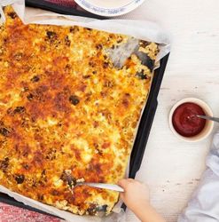Cevichepasta ja pinaatti-parmesaanisalaatti