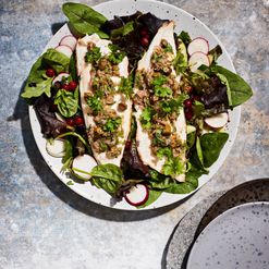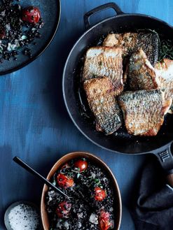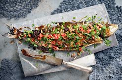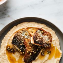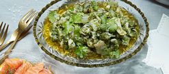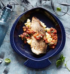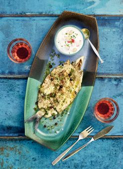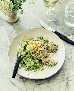 Pistaasikuorrutettu kala ja vihreä perunamurske
