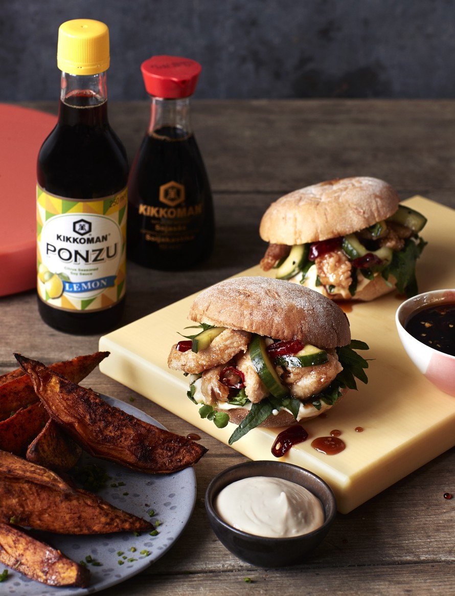 Tee bataattilohkojen seuraksi chili-soijaglaseeratut kanaburgerit. Katso resepti!