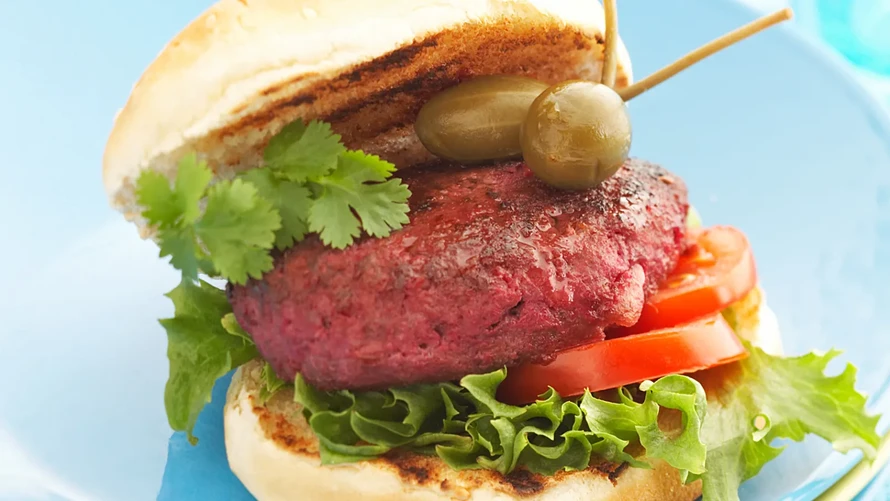 Kuumenna uuni 225 asteeseen. Sekoita sipulikeittoainekset, kermaviili ja korppujauhot kulhossa keskenään. Anna turvota muutama minuutti. Valuta ja raasta etikkapunajuuret. Lisää punajuuret, jauheliha ja kananmuna mureketaikinaan ja vaivaa tasaiseksi. Painele massasta kostutetuin sormin pihvejä leivinpaperin päälle uunipellille. Kypsennä uunin keskiosassa noin 20 minuuttia. Grillaa/kuumenna sämpylät nopeasti. Täytä punajuuripihveillä ja muilla haluamillasi täytteillä.