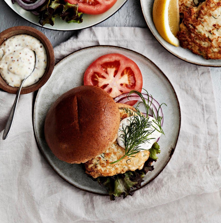 Kokoa hampurilaiset. Sipaise sämpylöille majoneesia. Täytä haukipihveillä ja kasviksilla.