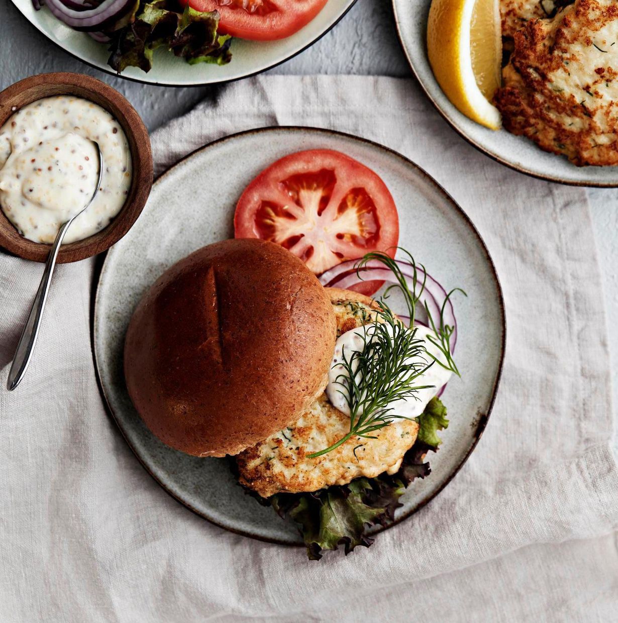 Valmista lisukkeet. Sekoita majoneesiin sinappi. Revi salaatti. Viipaloi tomaatit ja punasipuli. Silppua tilli. Paahda hampurilaissämpylät.