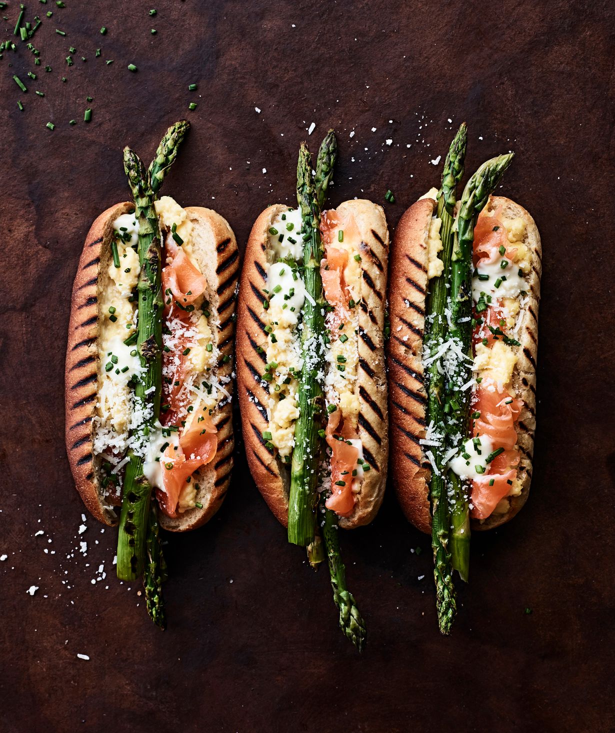 - Täytä sämpylät parsalla, munakokkelilla, lohella ja majoneesikastikkeella. Viimeistele parmesaanilla ja ruohosipulilla.