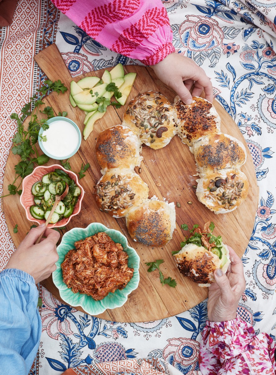 Sämpylöiden täytteeksi lastataan helppoa nyhtöbroileria ja kesäisiä hölskykurkkuja.