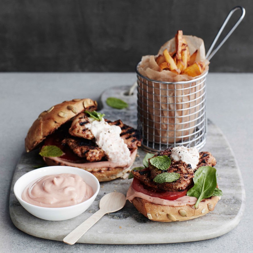 Kevyempi burgeri lastataan harissamarinoiduilla broilerinleikkeillä, maitorahkaisella tsatsikilla sekä ketsuppidipillä. Tarjoile kanneton burgeri palsternakkaranskisten kanssa.