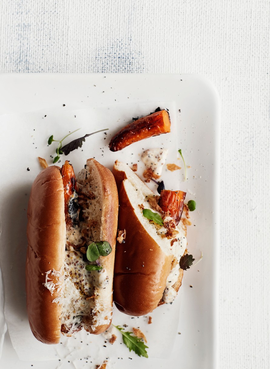 - Täytä hot dog sämpylät porkka-noilla sekä esimerkiksi majoneesilla, täysjyväsinapilla ja paahdetulla sipulilla.