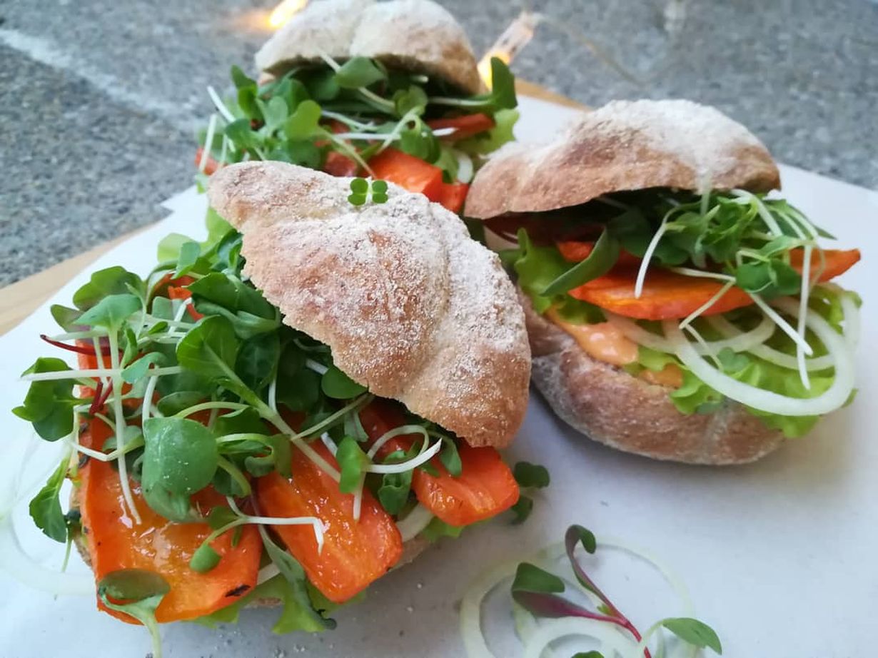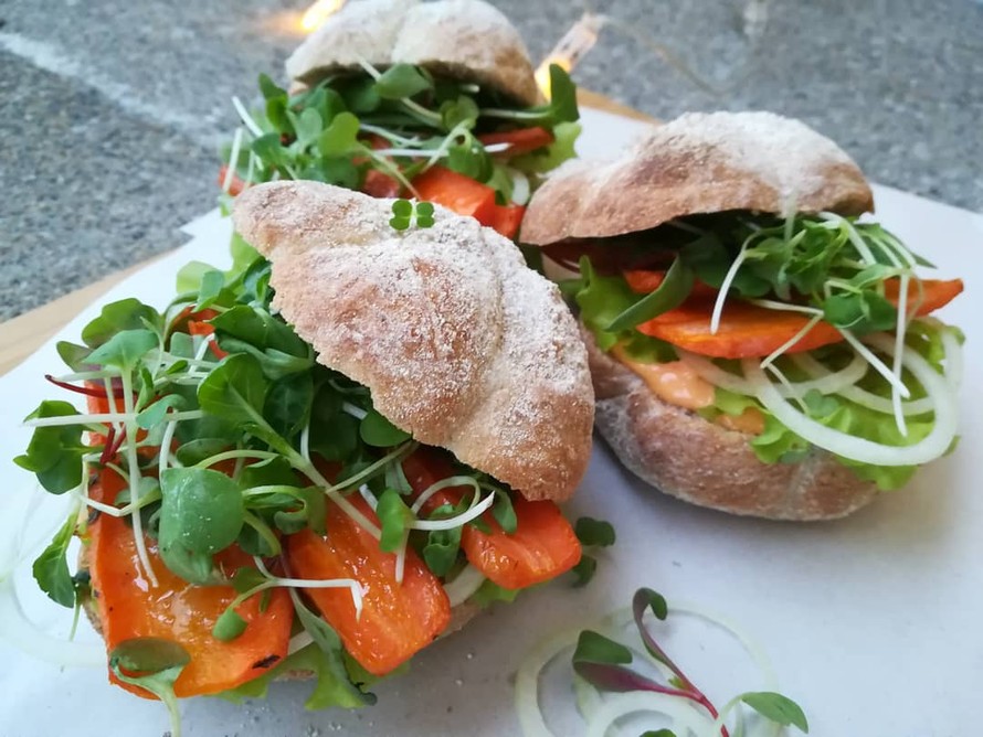 Kokoa kasvishampurilaiset levittämällä 4 sämpylälle paprikamajoneesi ja latomalla päälle paahdettuja porkkanoita, leikatut sipulirenkaat, rucolan verso, punamangoldia ja salaatinlehtiä.