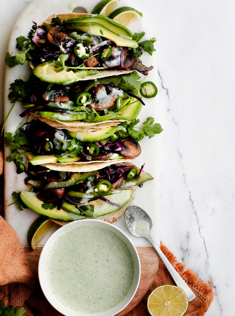 - Laita kullekin tortillalle reilusti korianteria, avokadoa ja herkkusienipaistosta. Mausta korianteri-piimäkastikkeella.