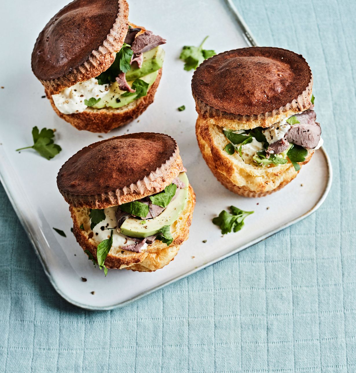 - Irrota popoverit varovasti, halkaise ja täytä ne majoneesilla / smetanalla, avokadolla ja paahtopaistilla. Halutessasi hienonna pinnalle vielä hieman lehtipersiljaa.