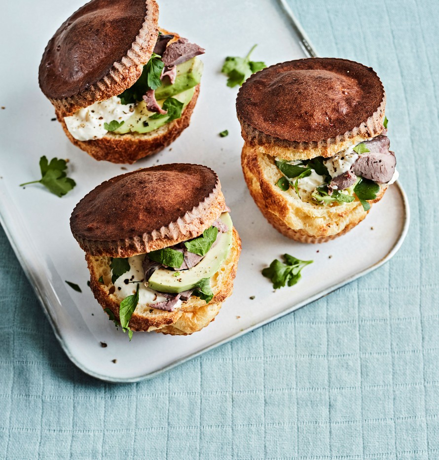Pannaritaikinasta tehty muffini eli "popover" on syy hankkia muffinipelti, sillä popover on helppoa ja hauskaa brunssiruokaa, sohvasyötävää tai saunapurtavaa. Tässä reseptissä täytteenä on paahtopaistia, avokadoa ja kipakalla piparjuurella maustettua majoneesia. Mutta jos olet kalan ystävä, savu- tai graavikala toimivat nekin loistavasti avokadon ja piparjuurimajoneesin kanssa. Vegeversioon voi valita vaikkapa avokadoa tai paahdettuja, marinoituja paprikoita sekä minttua ja hummusta.