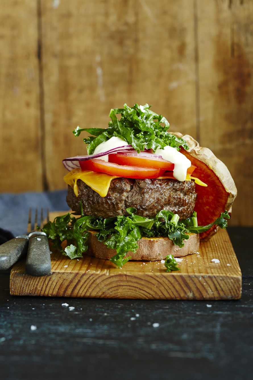 Bataattiburgeri on gluteeniton mutta kaikkea muuta kuin mauton. Kun höttösämpylän tilalla on terveelliset bataattiviipaleet ja täytteenä jättipihvi, kuka haluaisi muuta?
