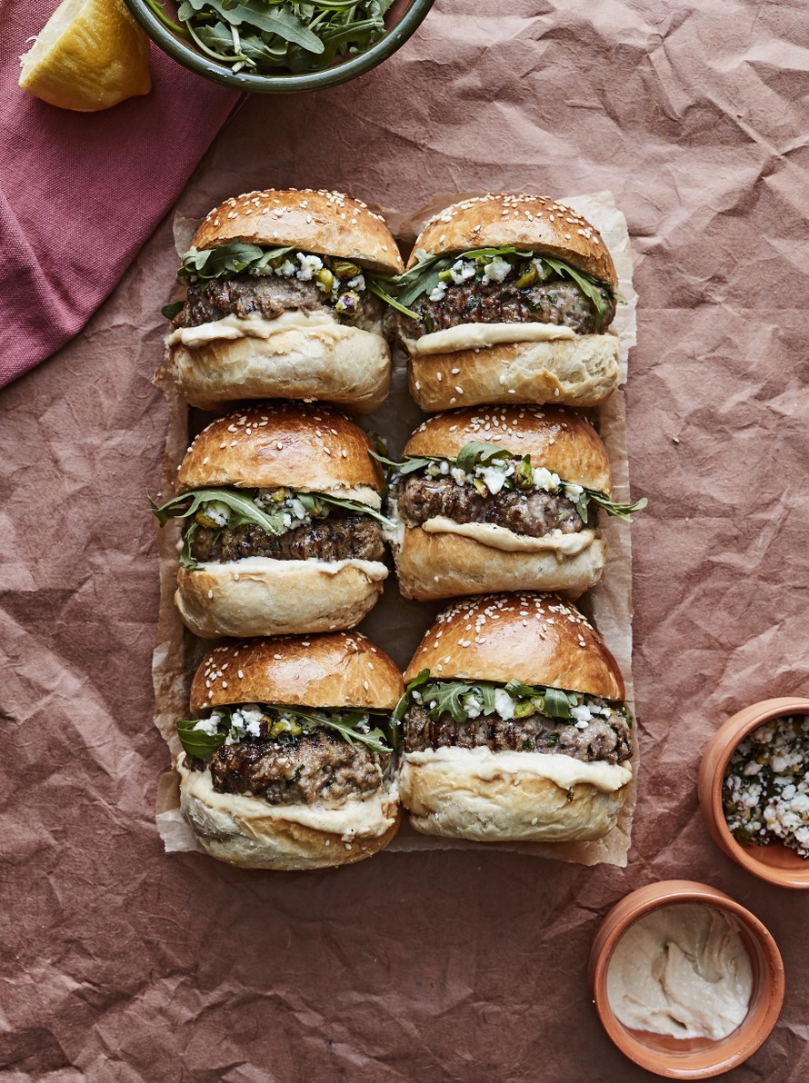 Tässä upeassa Lähi-idän burgerissa maistuvat pehmeä hummus, rouskuva pistaasi ja kermainen feta.
