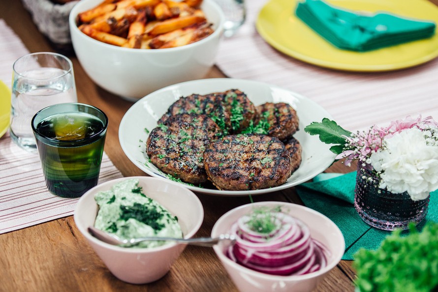 - Tarjoa hampurilaispihvit itse tehtyjen sämpylöiden, coleslawn, tomaatin, punasipulin ja nokkosmajoneesin sekä ranskalaisten (ohjeet alla) kanssa.