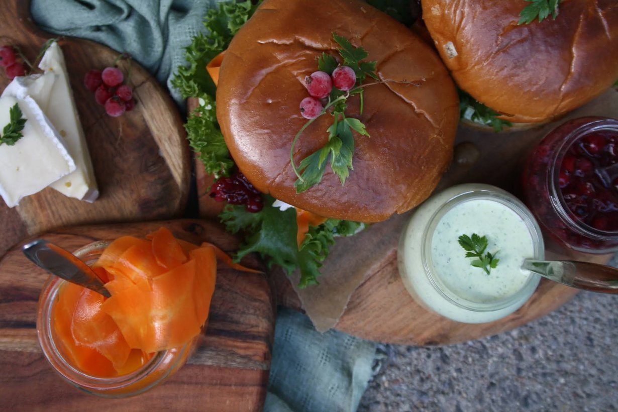Valuta porkkanaviipaleet. Kokoa hampurilaiset. Sivele lipstikka-jugurttikastike sämpylöiden pohjapuoliin ja punaherukkahilloa kansiin. Nosta pohjille salaatti, pihvit, brie ja tomaatti. Viimeistele pikkelöidyllä porkkanoilla. Nosta kannet päälle.