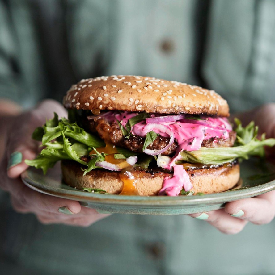Grillaa myös sämpylänpuolikkaat. Kuori ja leikkaa punasipuli renkaiksi. Täytä hampurilaiset niin, että laitat pohjalle mango-chutneytä, salaattia ja sipulia ja pihvin päälle punajuuritsatsikia.
