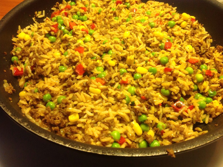 Kuori ja hienonna sipuli, kuullota se pannulla. Lisää curry ja jauheliha, ruskista. Sekoita joukkoon riisi ja kasvisliemi. Keitä kannen alla 25 minuuttia. Kun keittoajasta on noin 5 minuuttia jäljellä, lisää herneet ja maissit. Mausta suolalla Ja pippurilla. Koristele persiljalla ja paprikalla.