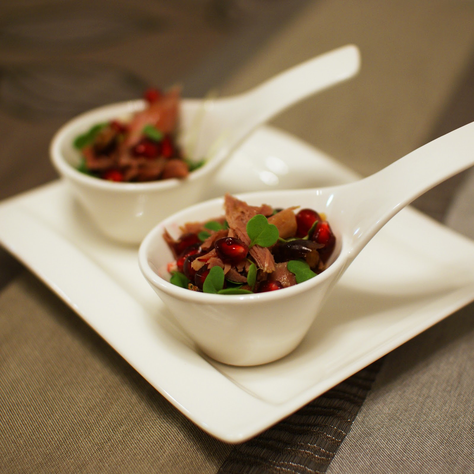 Kuluneen vuoden hektisestä päiväkoti-työ-kauppa-koti-rumbasta huolimatta olemme onnistuneet syömään kautta linjan varsin kelvollisesti (ja siinä sivussa kasvattamaan Pikkukokista melkoisen kulinaristiherkkuhiiren). Sen verran meno on kuitenkin muuttunut, että kun ennen viikonloppuisin kolmen ruokalajin menu oli standardi, nyt alkupalat ovat unohtuneet kaavasta ja jälkiruokakin tulee liian usein nautittua teollisen jäätelön muodossa. Tänä viikonloppuna alkupalapuoli koki sentään pienoisen heräämisen, kun pyöräytimme pienet keittiön tervehdys -tyyliset suupalat ennen pääruokaa.Upeanmakuinen granaattiomena ja makeanpehmeät taatelit ovat sesongissa ja pääsivät siksi mukaan annokseen, rucolanversot puolestaan valitsimme herkän ulkonäkönsä vuoksi keventämään tunnelmaa ja aito balsamico, se nyt vaan sopii melkeinpä minne vain! Osana Familian kanssa tehtävää yhteistyötä saimme testiin valmiiksi paistetun, pakasteena myytävän ankankoipi-confitin. Koipireisipalan mukana vakuumipaketissa tulee myös sen verran ankanrasvaa, että koiven voi näppärästi uudelleenlämmittää siinä. Keittiössämme ei puolivalmisteita ole juuri näkynyt, joten koipikin ehti viettää tovin pakastimessa, ennen kuin inventaarion yhteydessä löysimme sen hylättynä. Ei siis auttanut muu kuin heittää ennakkoluulot nurkkaan ja lähteä testailemaan.Ja niinhän siinä kävi, että sinne nurkkaan ne ennakkoluulot saivat jäädäkin, sillä pian huumaava ankantuoksu täytti keittiön ja kohta kattilasta nostettiin käsiinhajoavan murea ja maukkaan mehevä ankka-confit. Joskus oikotie onneen lienee sallittu.Eipä muuten olisi ollenkaan hassumpi idea aloittaa jouluaaton päivällistä tällaisella nopeasti valmistuvalla amuse bouchella. Maukasta joulunodotusta!Granaattiomenainen ankka-confit amuse bouche (6 kpl)1 Familian ankan koipireisi -confit (pakaste)puolikas granaattiomena2 kuivattua pehmeää taateliakourallinen rucolan versoja3 tl aitoa balsamicoaSulata ankankoipi-confit ja siirrä se rasvoineen kattilaan nahkapuoli alaspäin. Kuumenna rasva niin, että se poreilee hiljalleen, sulje kattila kannella ja anna ankan paistua viitisentoista minuuttia. Nosta koipi kattilasta ja irrota lihat luista. Riivi ankanliha haarukalla suupaloiksi.Irrota granaattiomenasta siemenet ja pilko taatelit pieniksi kuutioiksi. Kokoa annokset pieniin kulhoihin tai ruokalusikoihin kerroksittain ja lorauta päälle tilkkanen modenalaista balsamiviinietikkaa. Tarjoile.