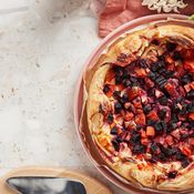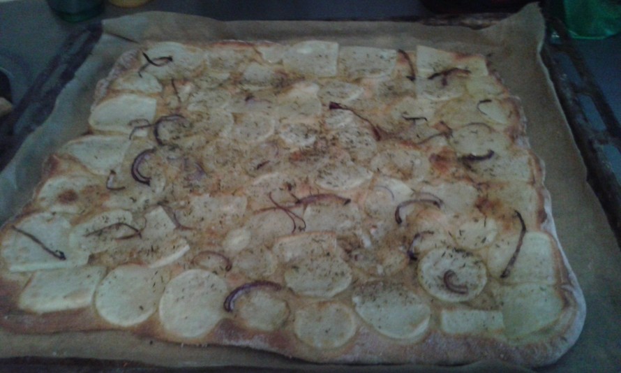 - Levitä taikinan päälle peruna-, kesäkurpitsa- ja sipuliviipaleet sekä yrtit ja suolaa.