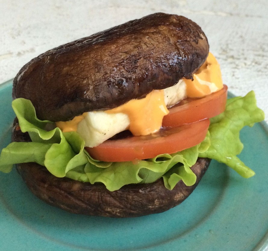 Vinkki! Voit täyttää burgerin myös paistetulla tofulla tai kasvispihvillä. Grillattu portobello sopii myös tavallisen sämpylään kootun hampurilaisen lihaisaksi kasvispihviksi.