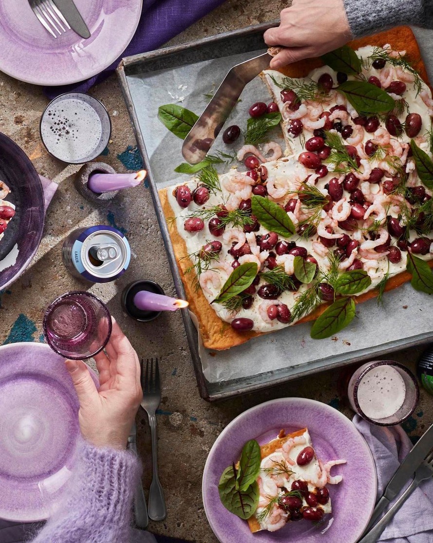 - Levitä jäähtyneelle pannarille sitruunajugurttia. Ripottele pinnalle katkarapuja ja paahdettuja viinirypäleitä. Viimeistele tillillä, viinisuolaheinällä ja mustapippurilla.