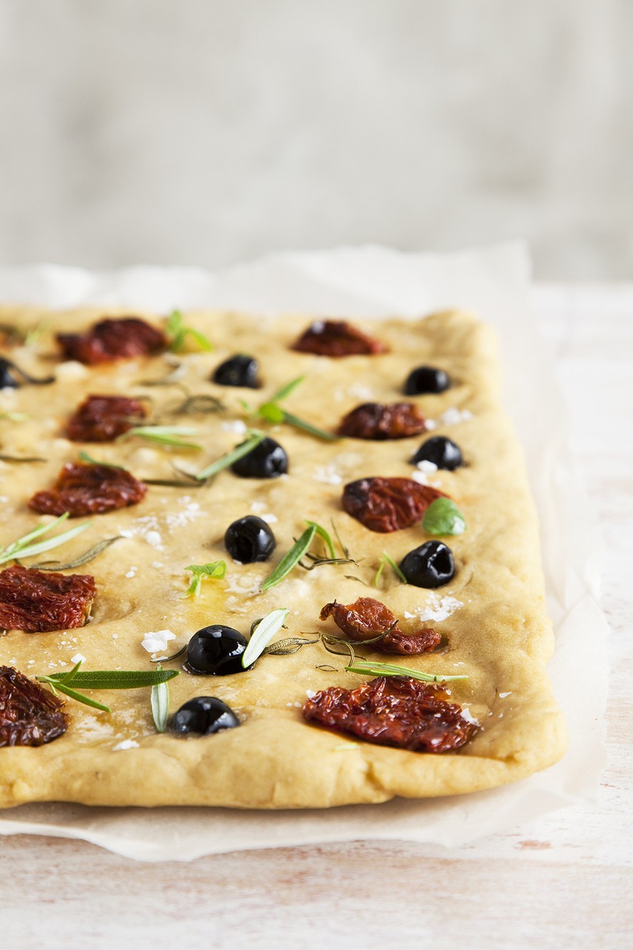 Painele aurinkokuivatut tomaatit, oliivit, rosmariini ja oregano taikinaan. Voit ripotella mausteeksi vähän suolahiutaleita.