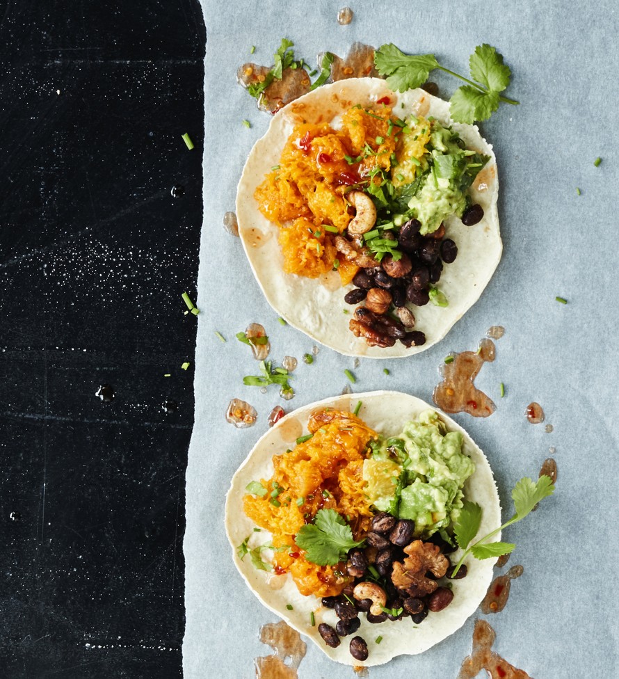 - Kokoa tortillat: kasaa päälle lämmintä nyhtökurpitsaa ja papu-pähkinäseosta, avokado-appelsiinisalsaa ja yrttisalaattia. Viimeistele chilikastikkeella.