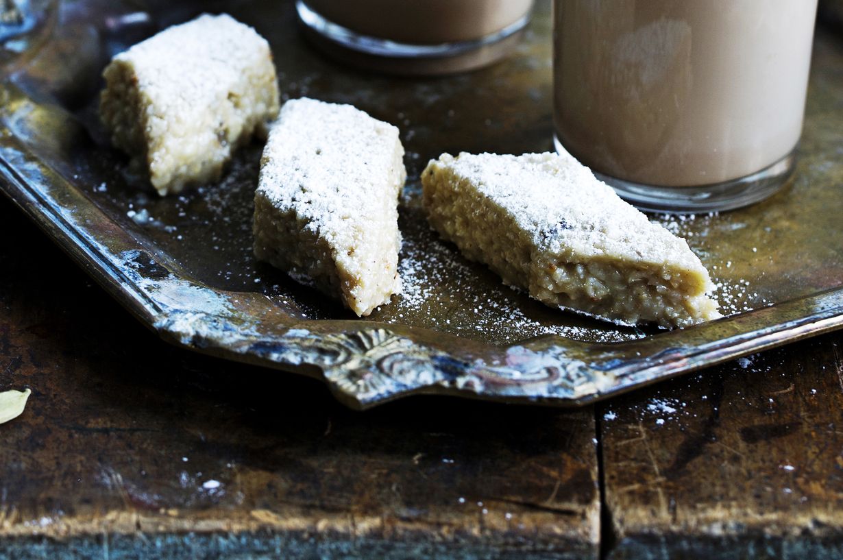 - Ota vuoka pakastimesta ja ripottele tomusokeria pinnalle. Leikkaa kovettuneesta barfimassasta vinoneliöitä kostutetulla terävällä veitsellä. Tarjoa masala latten kanssa.
