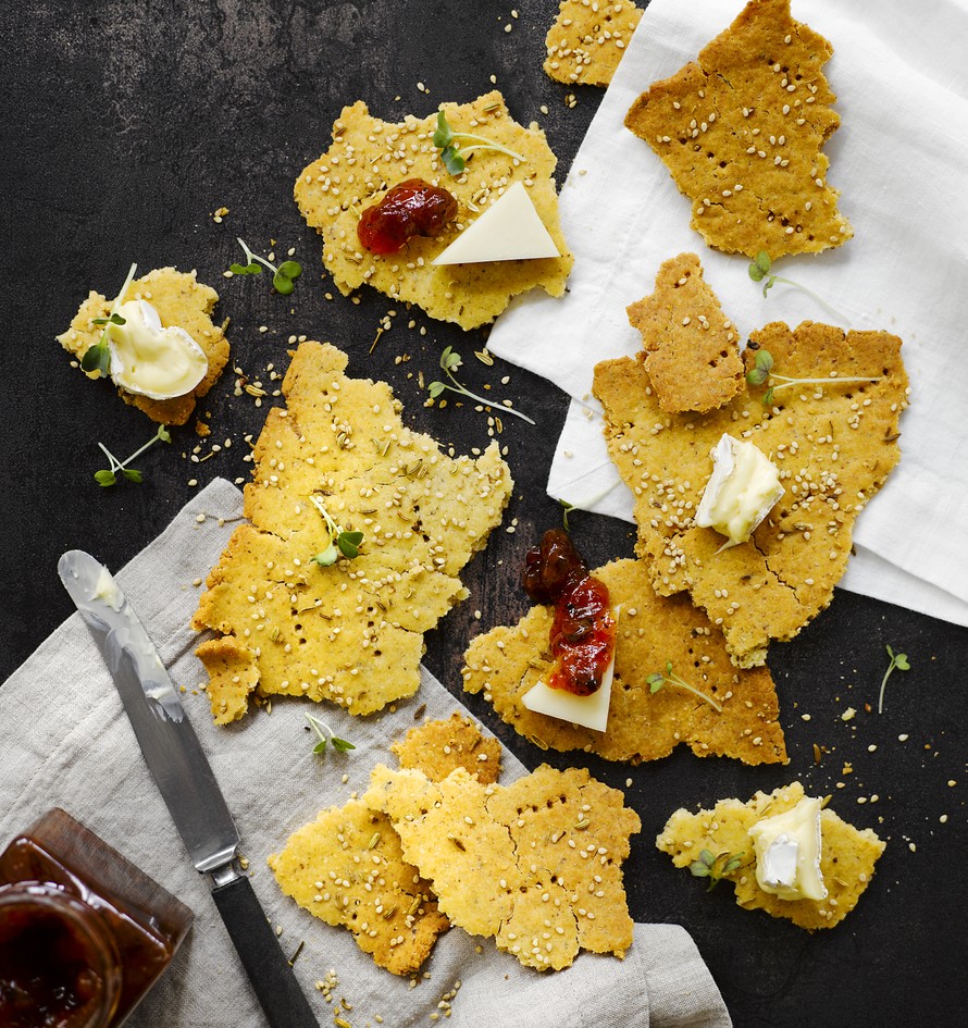 Itse tehdyt voileipäkeksit ja pari hyvää juustoa. Sitä enempää ei illanistujaisiin usein tarvita. Seesamin- ja fenkolinsiemenet maustavat gluteenittomat keksit.