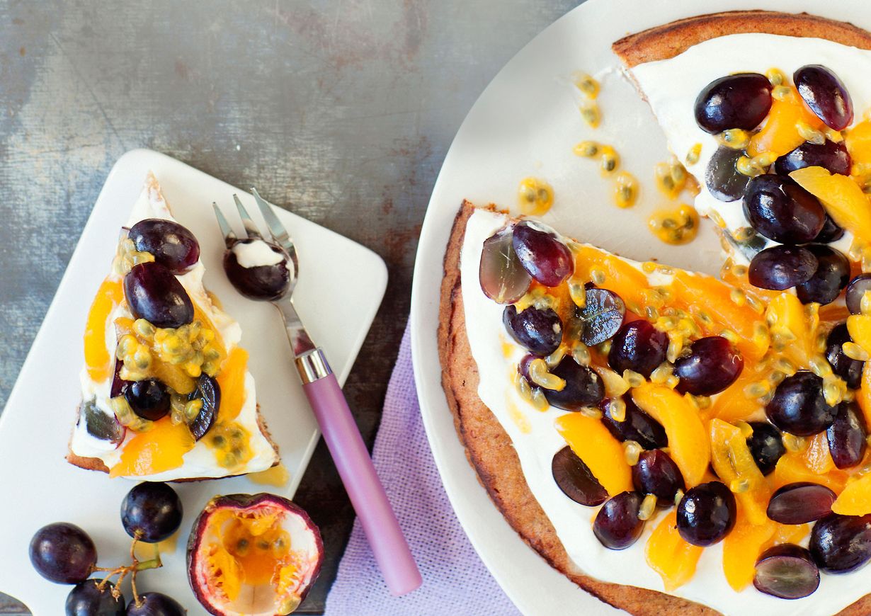 5. Paloittele tuoreet hedelmät. Levitä jugurtti jäähtyneen, tarjoiluvadille nostetun kakun päälle ja koristele hedelmillä.