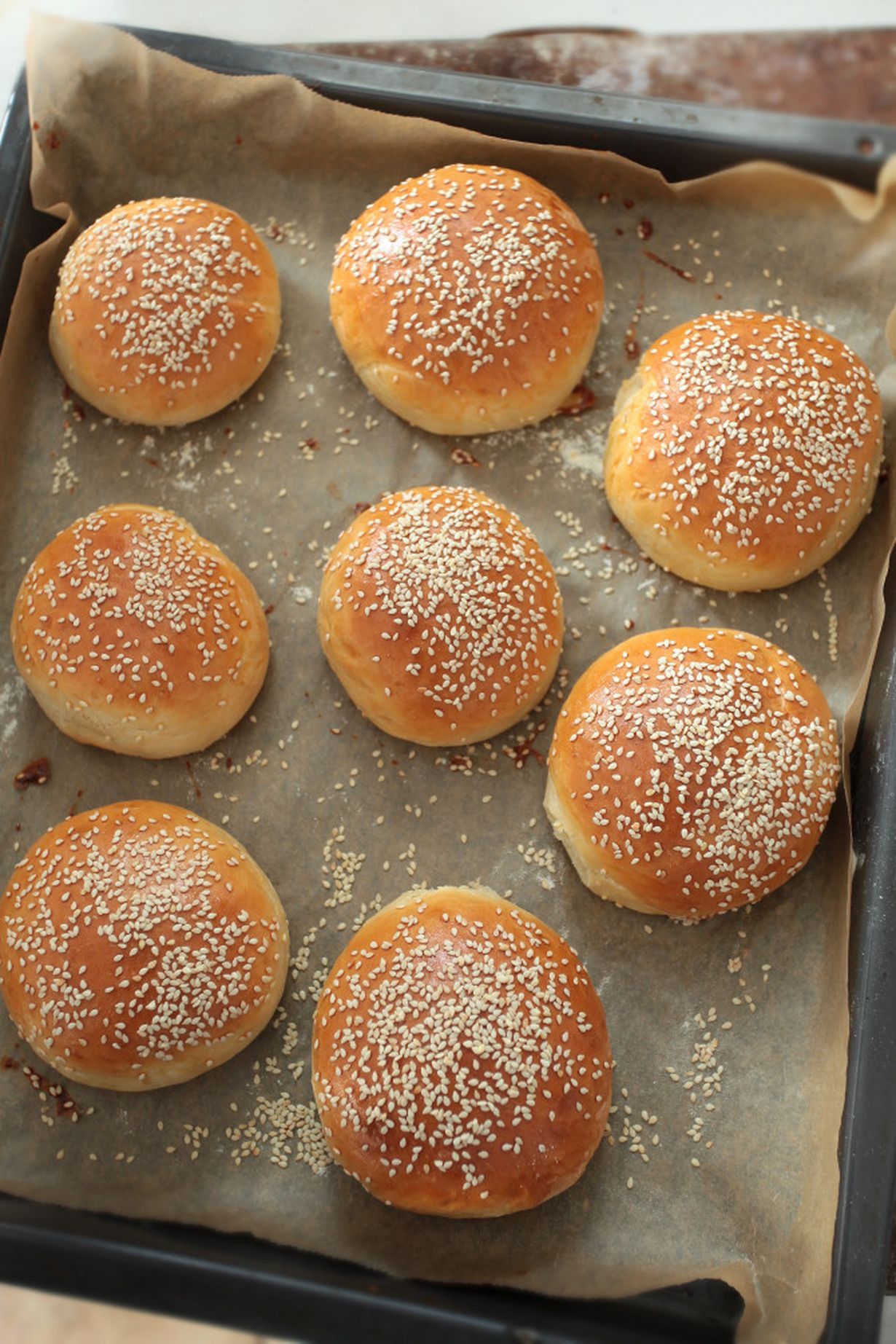 Vatkaa kananmuna kevyesti, sekoita siihen maito ja voitele kohonneet sämpylät kevyesti. Ripottele pinnalle seesaminsiemeniä. Paista 190 asteessa, 15-25 minuuttia.